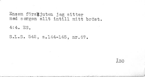//// Ensam förskjuten jag sitter //// med sorgen allt intill mitt bröst. //// 4:4. ES. //// S.L.S. 543, s.144-145, nr.67. //// ÅBO //// -----____--- -___-.V- --. ----.--^----^ -- i-- r- -T- -----,---- ----'----'- ---*---- ////