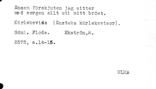 //// Ensam förskjuten jag sitter //// med sorgen allt uti mitt bröst. //// Kärleksviåa (Enstaka kärleksvisor). //// Sdml. Flöda. Ekström,H. //// ' v * '* //// 2573, s.14-15. //// ULMA ////