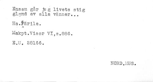 //// Ensam går jag livets stig //// glgmd av alla vänner... //// Hs.#ärila. //// Mskpt.Visor VI,s.886. //// E.U. 28166. //// NORD.MUS. ////