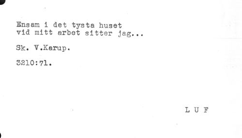 //// Ensam i det tysta huset //// vid mitt arbet sitter jag... //// Sk. V.Karup. //// 3210:71. //// L U F //// * ////