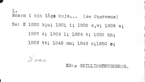//// i. ' //// Ensam i min låga koja... (Av Choraeus) //// Se: E 1800 k;u; 1801 i; 1802 o,v; 1806 e; I //// 1807 c; 1809 1; 1824 t; 1832 hh; i //// 1839 tt; 1846 mm; 1849 z;1850 o; //// : //// i //// KB:s SKILLm&TRYGESREG. //// - ////