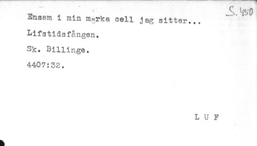 //// A ^st) //// Ensam i min m^rka cell jag sitter... //// Lifstidsfången. //// Sk. Billinge. //// 4407:32. //// L U F ////