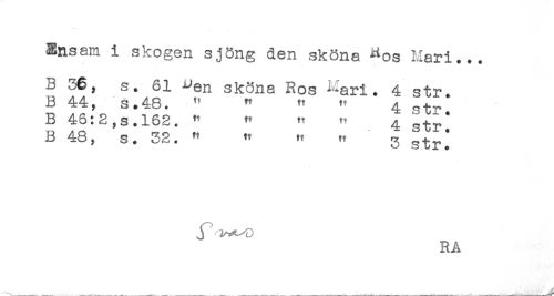 //// Ensam i skogen sjöng den sköna Ros Mari... //// B 36, s. 61 -L*en sköna Ros L*ari. 4 str //// B 44, s.48. " " ^ " 4 //// B 46:2, s. 162. " ^ " 't 4 ^y* //// B 48, s. 32. " ^ " " g //// RA ////