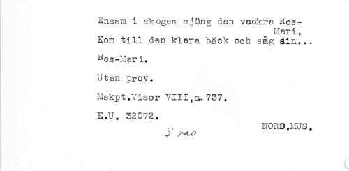 //// Ensam i skogen sjöng den vackra Kos- //// Mari , //// Kom till den klara bäck och såg åin... //// Ros-Mar i. //// Utan prov. //// Mskpt.Visor VIII,s.. 737. //// E.U. 32072. //// NORB.MUS. ////