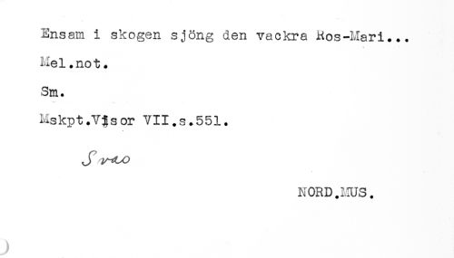 //// Ensam i skogen sjöng den vackra Kos-Mari... //// Mel.not. //// Sm. //// Mskpt.Vj^sor VII.s.551. //// NORD.MUS. ////