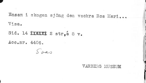 //// L //// H //// Ensam i skogen sjSng den vackra Ros Mari... - //// Visa. ^ //// Sid. 14 tKXIXt 2 str^a 8 v. i //// Acc.nr. 4406. !j //// ! //// < //// VARBERG MUSEUM 1 ////