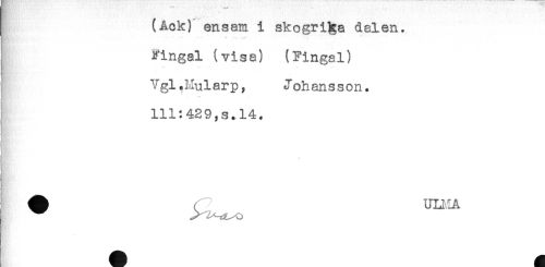 //// (Ack) ensam i skogri^a dalen. //// I Fingal (visa) (Fingal) //// t Ygl.Mularp, Johansson. //// * **** t //// 111:429,s.14. //// i //// } ^ ( uniA ////