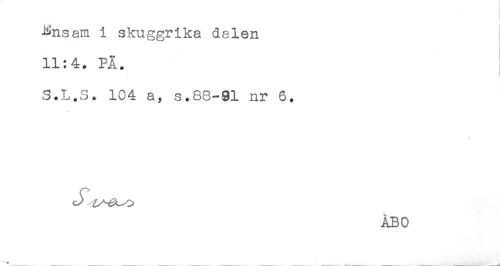 //// Ensam i skuggrika delen //// 11:4. PA. //// S.L.S. 104 a, s.88-91 nr 6. //// //// /ÅBO //// *.._----- ----- .---- ----- ....---- ..--.____- . -- __ ___... --____ _____ ^ ////
