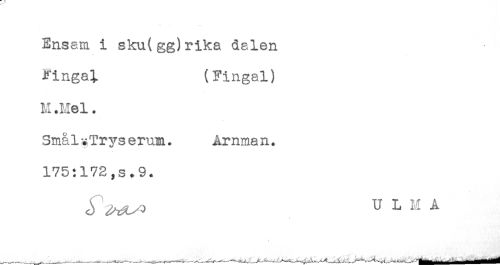 //// Ensam i sku(gg)rika dalen //// Fingal (Fingal) //// M .Mel. //// SmålitTryserum. Amman. //// 175:172,3.9. //// U L M A ////
