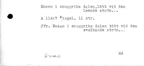 //// Ensam i skuggrika dalen,lätt vid den //// leende ström... //// ^ A 114:7 "ingal. 11 str. //// * *' //// : //// i //// i Jfr. Ensam i skuggrika dalen tätt vid den //// svalkande ström... //// : //// r^ RA ////