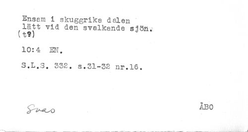 //// Ensam i skuggrika dalen //// lätt vid den svalkande sj8R. //// (t?) //// 10:4 EF. //// S.L.S. 332. s.31-32 nr.16. ////