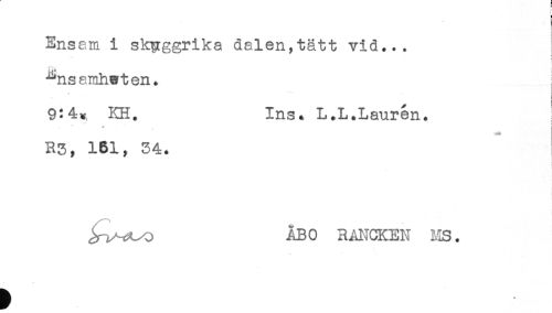 //// * ^ //// r //// Ensam i skuggrika dalen,tätt vid... //// -^nsamhwten. //// - < //// KH. Ins. L.L.Lauren. //// R3, 151, 34. //// ^n^uo ÅBO RANCKEN I-.IS. ////