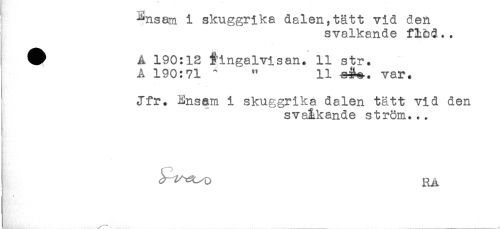 //// -K*nsam i skuggrika dalen,tätt vid den //// svalkande fIM. . //// ^ A 190:12 #ingalvisan. 11 str. //// A 190:71 ^ " 11 var. //// Jfr. Ensam i skuggrika dalen tätt vid den //// svaåkande ström... //// j //// y RA ////