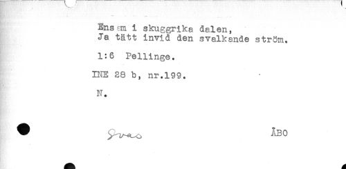 //// * //// - //// Ens cm i skuggrika dalen, //// Ja tätt invid den svalkande ström. //// - //// 1:6 Pellinge. //// INE 28 b, nr.199. //// N. ////