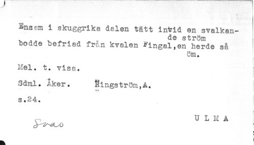 //// Ensam i skuggrika dalen tätt inlfid en svalkan- //// . , de ström //// bodde befriad från kvalen Fingal,en herde så //// öm. //// Mel. t. visa. //// Sdml. Åker. Ringström,A. //// s.24. i //// ! //// t //// ! ////
