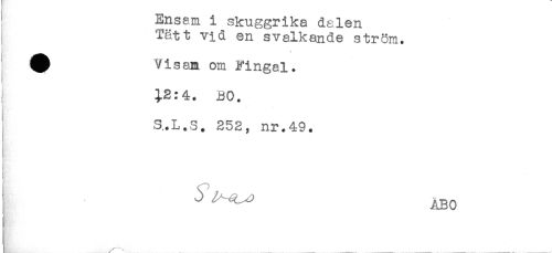 //// Ensam i skuggrika dalen //// j Tätt vid en svalkande ström. //// t //// ^ Visarn om Fingal. //// ! 12:4. BO. //// S..L.S. 252, nr.49. //// ? //// < //// ^ ^^ ABO ////
