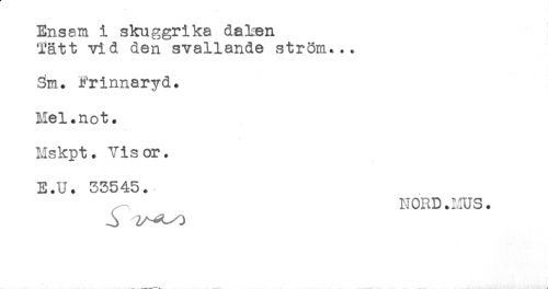 //// Ensam i skuggrika dalen //// Tätt vid den svallande ström... //// Sm. frinnaryd. //// Mel.not. //// Mskpt. Visor. //// E.U. 33545.- //// NORD.HUS. ////