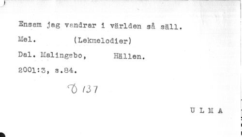 //// Ensam jag vandrar i världen så säll. //// ! //// j //// Mel. (Lekmelodier) //// .. ,. < //// Dal. Malingsbo, Hällen. //// i //// 2001:3, s.84. //// U L M A //// < //// H //// < //// ! //// ^ ! ////