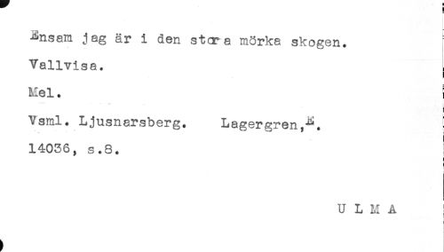 //// Ensam jag är i den stcra mörka skogen. //// Vallvisa. //// i //// Mel. , //// a //// Vsml. Ljusnarsberg. Lagergren,-^. ! //// - //// 14036, s.8. ! //// < //// ! //// U L M A ! //// ' //// ! //// ! ////