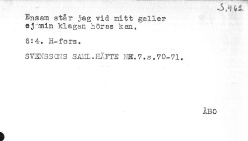 //// Ensam står jag vid mitt galler //// ej min klagan höras kan, //// 4 //// 6:4. H-fors. //// .. //// SVEN3SCNS SAML. HÄFTE NK.7.s.70-71. //// ÅBO ////