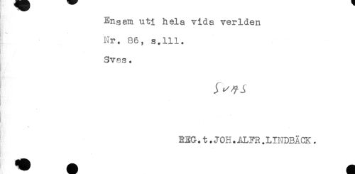 //// Ensam uti hela vida verlden //// Nr. 86, s.lll. //// Svas. //// .f^J- //// REG.t.JOH.ALFR.LINDBÄCK. //// ! //// I ////