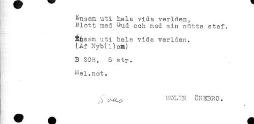 //// Ensam uti hela vida verlden, //// Rlott med Gud och med min nötta staf. //// A&sam uti hela vida verlden. //// (Af Nyb(i)om) //// B 208, 5 str. //// Mel.not. //// * //// ^ ^^ MOLIN ÖREBRO. //// * ////