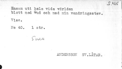 //// Ensam uti hela vida världen //// blott med Gud och med min vandringsstav. //// * . 7 <- //// Visa. //// Ne 40. 1 str. //// t //// . //// ! //// ! //// ANDERSS0N SV.LÅTAR. ////