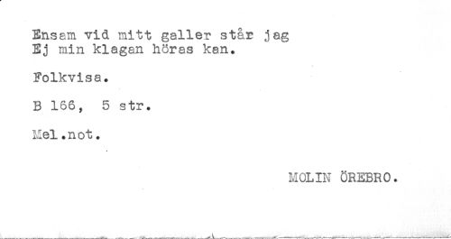 //// Ensam vid mitt galler står jag //// Ej min klagan höras kan. //// Folkvisa. //// B 166, 5 str. //// Mel.not. //// MOLIN ÖREBRO. ////