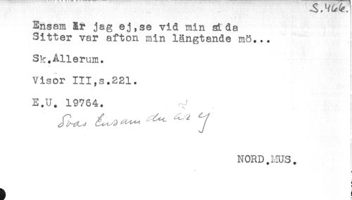 //// Ensam är jag ej,se vid min sida //// Sitter var afton min längtande mö... //// Sk.Allerum. //// Visor III,s.221. //// E.U. 19764. ^ //// ! //// NORD.HUS. //// t //// f //// ä ) ////