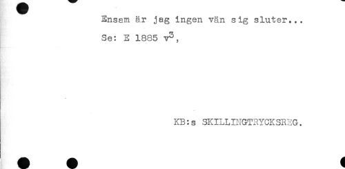//// Ensam är jag ingen vän sig sluter... //// Se: E 1885 v3, //// - //// KB:s SKILLINGTRYCKSREG. //// * * 1 ////