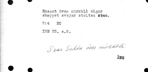 //// Ensamt över mörkblå vågor //// skeppet svajar stoltan stam. //// 7:4 EC //// INE 33, s.2. //// ÅBg ////