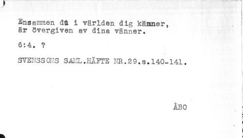 //// Ensammen dt i världen dig känner, //// är övergiven av dina vänner. //// i //// 6:4. ? //// SVENSSONS SAHL .HÄFTE KR.29.s.140-141. //// < //// ' //// ÅBO //// < //// t //// ^ //// ) ////
