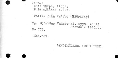 //// ^^ \ -Lii ue //// /Ente värper tippa, //// Bnie mjålkar sutta. //// Falska från tadsbo (Björkäng^ //// Vg. Björkäng,Vadsbo hd. Uppt. Adolf //// ^ Brandels 1880-t. //// No 776. //// B; //// } Med.not. //// LANDSl.IÅLSARKr/ET I LUIJD. ////