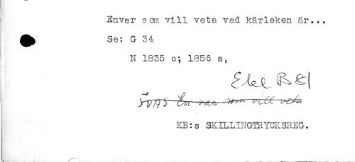 //// Envar son vill veta vad kärleken är... //// - //// ^ Se: G 34 //// N 1835 c; 1856 a, //// ^ ^^ Ofy"- ^tZf Mi^ //// KB:s SKILLINGTRYCK3REG. ////