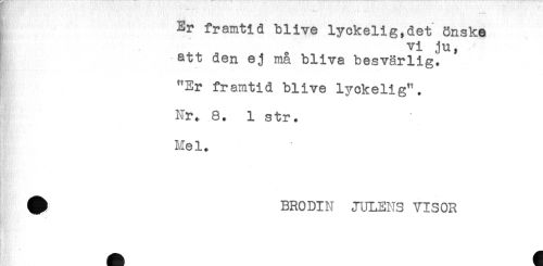 //// Er framtid blive lyckelig,det önske //// vi ju, //// att den ej må bliva besvärlig. //// "Er framtid blive lyckelig". //// Nr. 8. 1 str. //// Mel. //// # BRODIN JULENS VISOR ////
