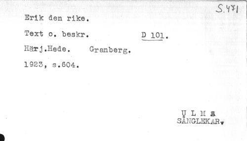 //// Erik den rike. //// Text o. beskr. D 101. //// **- i //// < //// ! //// Här j.Hede. Granberg. //// -f //// 1923, s.604. //// U L M a //// SA1IG-LEKART ////
