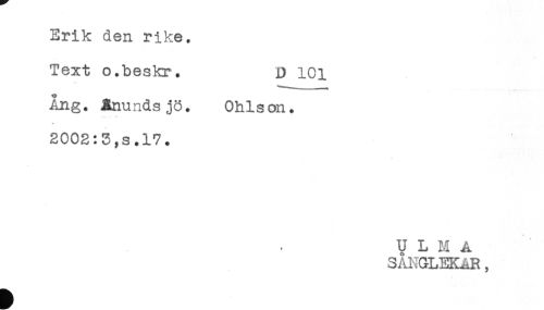 //// Erik den rike. //// Text o.beskr. D 101 //// Ång. Anundsjö. Ohlson. //// St * //// 2002:3,s.17. //// U L M A //// SÅNGLEKAR, ////