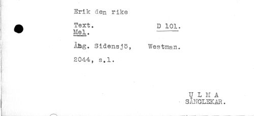 //// Erik den rike //// ^ Text. D 101. //// ^ Mel. - //// i //// { //// ) //// { Ähg. Sidensjö, Westman. //// 3044, s.l. //// ! //// i! //// ! //// < //// U L M A //// SANGLEKAR. ////