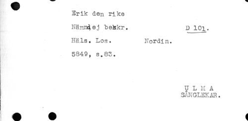 //// Erik den rike //// Nämn%ej behkr. D 10i. //// - //// Häls. Los. Nordin. //// 5849, s.83. //// U L M A //// SÅNGLEKAR. ////