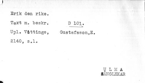 //// Erik den rike. //// Text m. beskr. D 101. //// Upl. Våttinge, Gustafsson,E. //// < //// 2140, s.l. //// //// /U L M A //// MGLEKAR ////