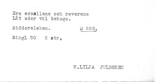//// -* //// Ers excellens och reverens //// Låt eder väl behaga. //// Riddareleken. B 229. //// Ringl 50 2 atr, //// N.LILJA JULBOKEN ////