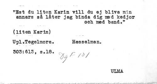 //// ... .. - . - ^ .... //// "Est du liten Karin vill du ej bliva min //// annars så låter jag binda dig med kedjor //// och med band." //// (liten Karin) //// ... r.* *. //// Upl.Tegelmora. Hes s elman. //// 303:613, s.18. //// /ULMA ////