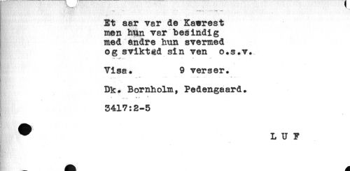 //// .... - - ..- -- //// Et aar var de Kavrest //// men hun var besindig //// med andre Imn svermed //// o g sviktad sin ven o.s.v. //// .^t*., * * -* //// * //// Visa. 9 verser^ //// g./. ^ . -- ^ -<-.. -- -- -- //// Bomholm, Pedengaard. //// * //// 3417:2-5 //// ^ L U F //// rM ////