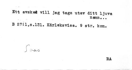 //// Ett avsked vill jag taga utav ditt ljuva //// nann,.. //// ^ ... * ' * -- ^ _ //// B 27il,s.l31. Kärleksvisa. 9 str. kom. //// RA ////