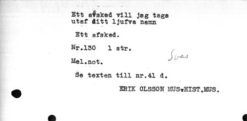 //// ..... . .- . -sv- //// Ett avsked vill jag taga //// utaf ditt ljufva namn //// - . .... - //// Ett afsked. //// Nr.130 1 str. //// - ...... - //// Mel.not. //// 4 //// Se texten till nr.41 d. //// c //// ^ ERIK OLSSON HUS-THIST.MUS. //// * ////