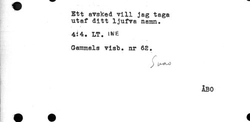 //// Ett avsked vill jag taga //// utaf ditt ljufva namn. //// 4:4. LT. 'MÉ //// Gammals visb. nr 62. //// ÅBO ////