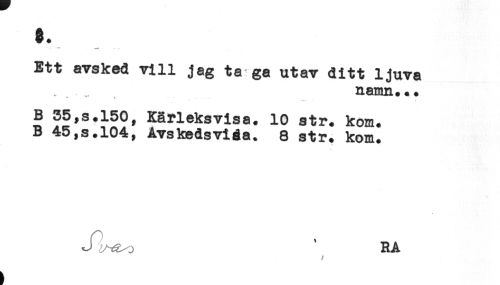 //// t. //// ** - - , //// Ett avsked vill jag ta ga utav ditt ljuva //// . namn... //// ^ * * .... //// - //// B 35,s.150, Kårleksvisa. 10 str. kom. //// B 45,s.104, Avskedsviga. 8 str. kon. //// Jl^&o ' RA ////
