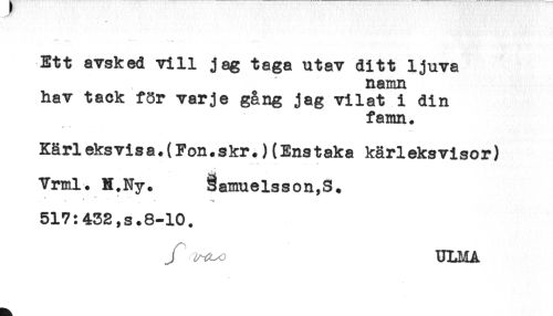 //// Ett avsked vill jag taga utav ditt ljuva //// namn //// hav tack fSr varje gång jag vilat i din //// famn. //// y. - //// Kärl eks vis a.(Fon. skr.) (Ens t aka kärl eks viso r) //// Vrml. it.Ny. Samuelsson,S. //// -' * - * ' //// 517:432,s.8-10. //// y ULMA ////