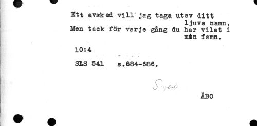//// Ett avsked vill* jag taga utav ditt //// ljuva namn, //// Men tack för varje gång du har vilat i //// min famn. //// \ //// 10:4 //// ' ' ' - - < //// SLS 541 s.684-686. //// ÅBO //// H* ////