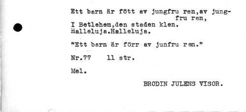 //// Ett barn är fött av jungfru ren,av jung- //// fru ren, //// ^ I Betlehem,den staden klen. //// " Halleluja.Halleluja. //// . . ^ .. //// t //// "Ett barn är förr av junfru ren." //// Nr.77 11 str. //// * ^ //// Mel. //// BRODIN JULENS VISOR. //// ' \ _ _ ___ ////